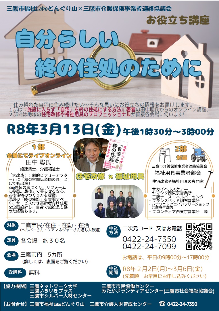 三鷹市福祉Laboどんぐり山 〒181-0015 東京都三鷹市大沢4丁目8番8号TEL:0422-24-7099