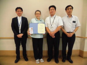 今回表彰された職員は、在職20年の職員が1名、在職10年の職員が7名で合計8名の方です。大石田理事長より表彰状、原島常務理事より記念品を一人ひとりに手渡しました。事業団の更なる発展のために、引き続きよろしくお願いいたします。