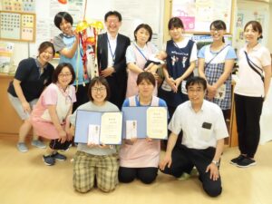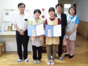 今回表彰された職員は、在職20年の職員が1名、在職10年の職員が7名で合計8名の方です。大石田理事長より表彰状、原島常務理事より記念品を一人ひとりに手渡しました。事業団の更なる発展のために、引き続きよろしくお願いいたします。