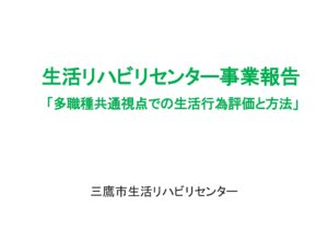 - 発表資料のうち、三鷹市介護人財育成センターと三鷹市生活リハビリセンターのスライドのPDFファイルを、本ページからダウンロードいただけます。