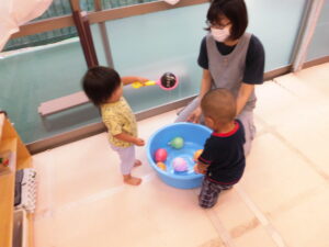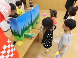 翌日、今度は年長クラスがお店屋さんとなって、ホールにて3・4歳児クラスが夏まつりを楽しみました。1・2児歳クラスはお店屋さんがお部屋に回ってきて、各お部屋にて楽しみました。慣れた場所での開催とあってリラックスしていた様子です。0歳児クラスは、夏まつりごっこ自体の参加はありませんでしたが、お土産を持ち帰りおうちで楽しめたようでした。