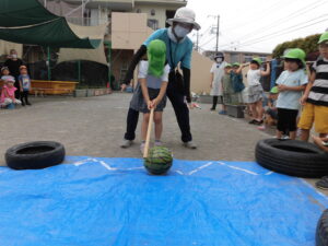 7月中旬、すいかわりを行いました。こちらも西野保育園の恒例行事です。