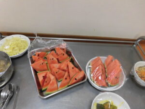 幼児3クラスですいかわりを行い、本物のすいかに触れて観察したり匂いを嗅いだり、給食で食べたり…それぞれの学年にあった楽しみ方で、すいかわりを楽しみました。