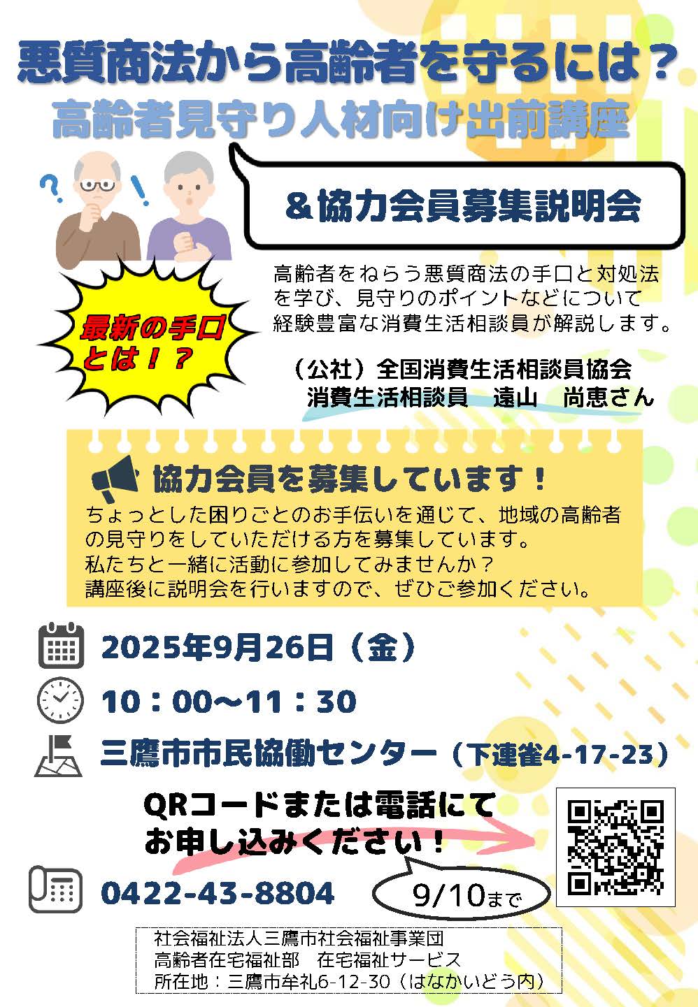 高齢者を狙う悪質商法の手口と対処法を学び、見守りのポイントなどについて経験豊富な消費生活相談員が解説します。