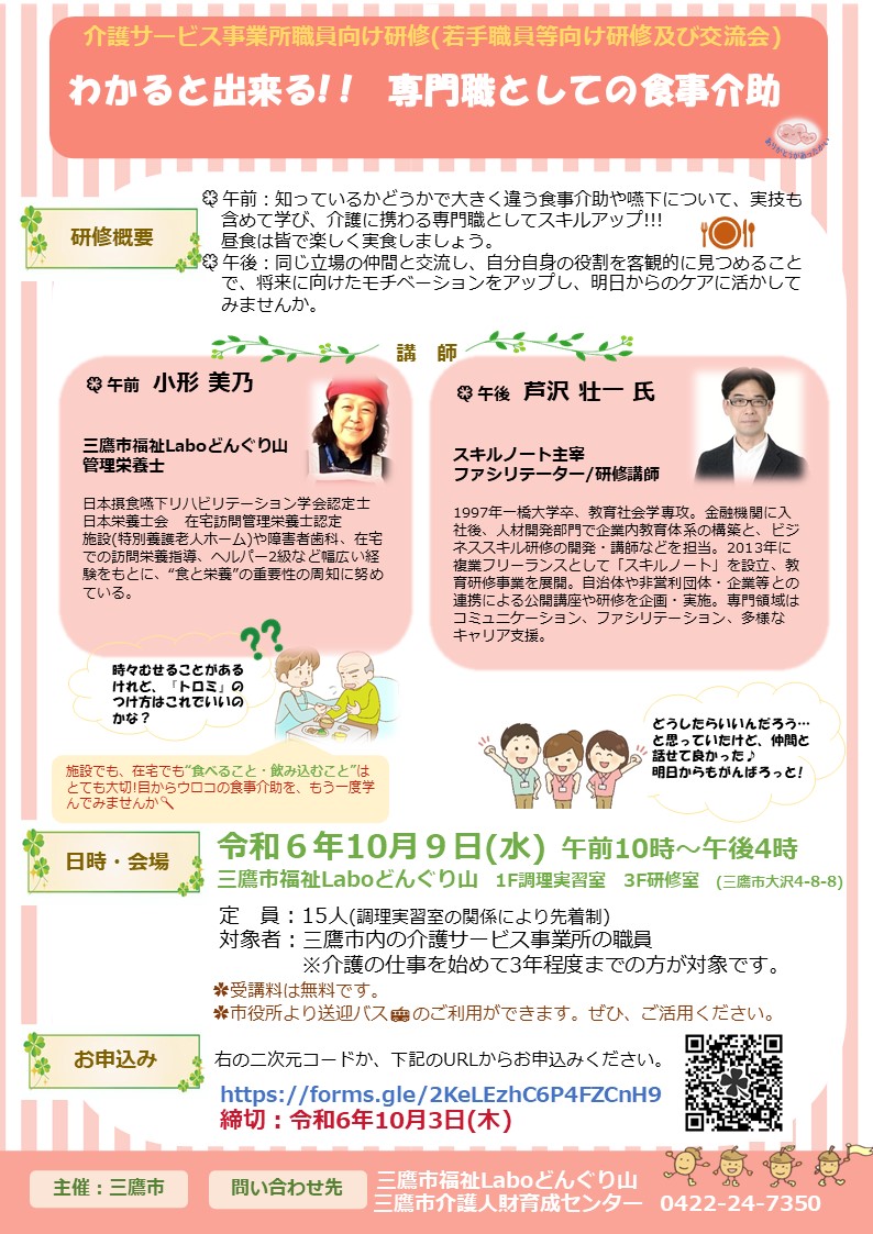 【介護サービス事業所職員向け研修(若手向け) 『わかると出来る!! 専門職としての食事介助』のご案内】 10/9(水)