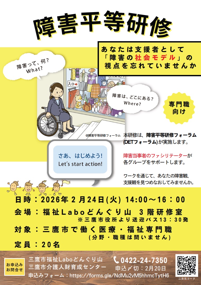 本研修は、障害平等研修フォーラム(DETフォーラム)のさまざまな障害当事者が5名、どんぐり山に来てくださり、講師・ファシリテーターをつとめます。ワークを通じて、「社会モデル」について改めて考え学びなおすことができます。自分の障害観、支援観を見つめなおし、明日の支援に生かしませんか。